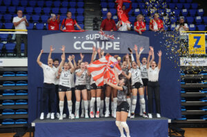 La joie des Mulhousiennes aprés leur victoire en Super Coupe Paris-Levallois – VMA (Volley Mulhouse Alsace), à Levallois-Perret le 7 octobre 2025.